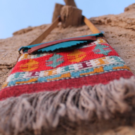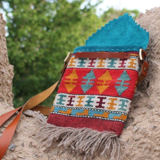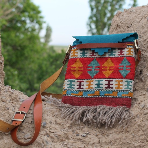 کیف گلیم، بافته شده با پشم و چرم طبیعی برای بندودر کیف، صد در صد دست دوز، آستر دوزی شده، بند کیف قابل تنظیم